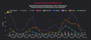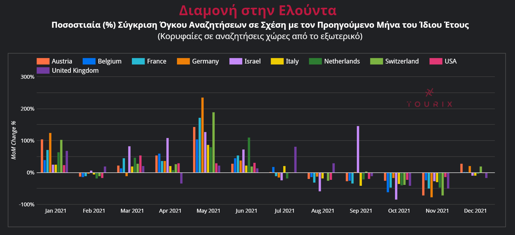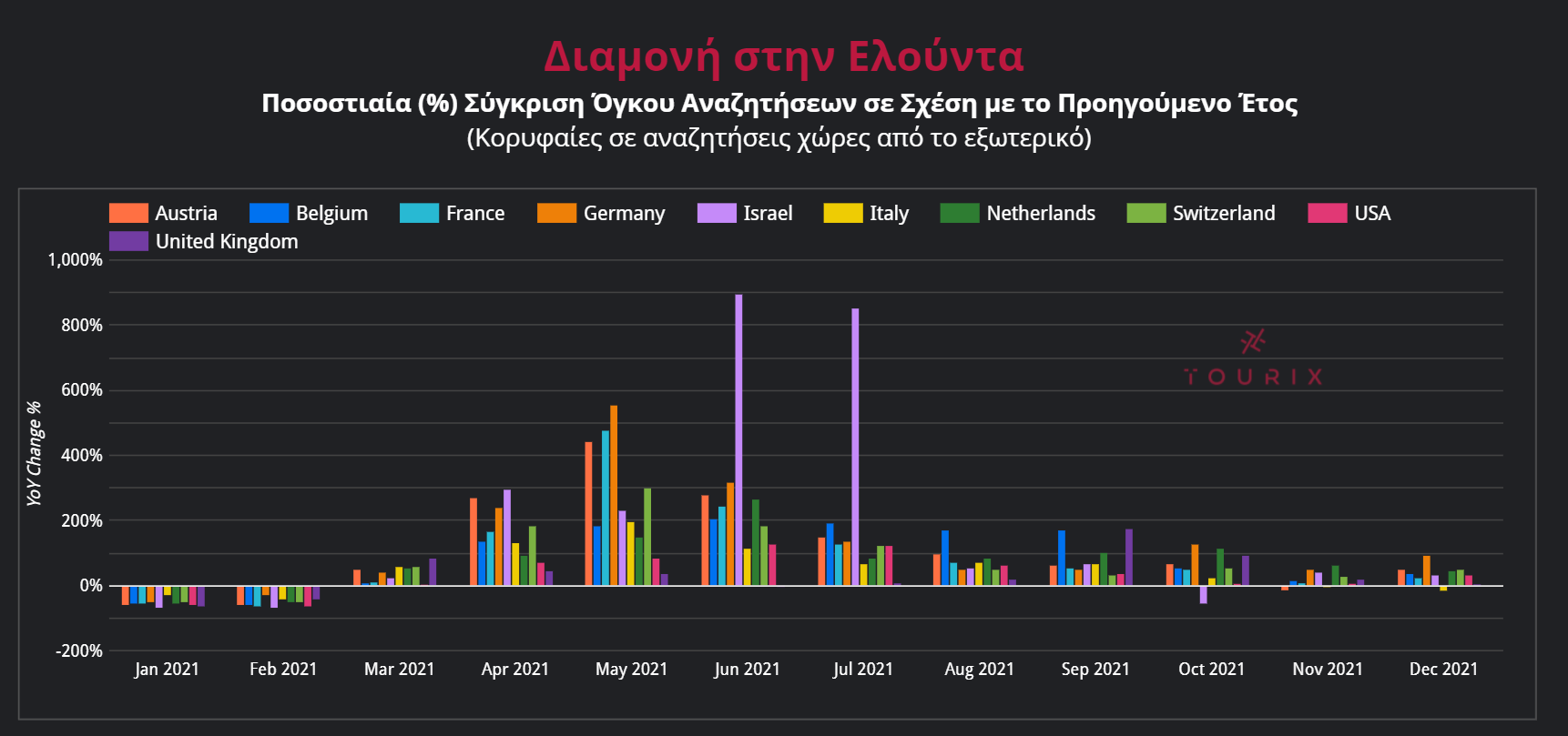 - Συγκριτικά με το 2020, το 2021 όλες οι παραπάνω χώρες που παρουσίασαν συνολικά αυξημένο ενδιαφέρον, με εντονότερες αυξήσεις αυτές από Ισραήλ 114% και Γερμανία 92%.