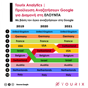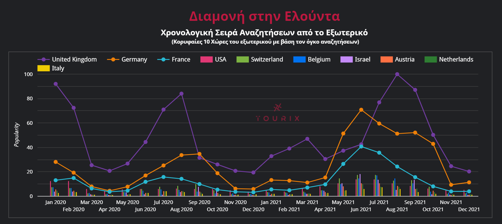 - Χρονολογικά, στις αρχές του 2021 παρατηρήθηκε μειωμένο ενδιαφέρον (Ιανουάριος – Απρίλιος) και οι περισσότερες αναζητήσεις προήλθαν από το Ηνωμένο Βασίλειο, με δεύτερη την Γερμανία και τρίτη την Γαλλία. Με την άρση των μέτρων της καραντίνας και την έναρξη της καλοκαιρινής περιόδου οι αναζητήσεις παρουσίασαν μεγάλη αύξηση τον Μάιο, με εντονότερη αυτή από Ελβετία, Γερμανία, Αυστρία και Γαλλία. Εκείνη την περίοδο, η Γερμανία ανέβηκε στην κορυφή των αναζητήσεων, με το Ηνωμένο Βασίλειο και την Γαλλία στην δεύτερη και τρίτη θέση αντίστοιχα. Από τον Ιούλιο παρουσιάζεται σταδιακή μείωση από την πλειοψηφία των χωρών, το Ηνωμένο Βασίλειο παρουσιάζει ραγδαία αύξηση και περνάει στην κορυφή των αναζητήσεων.