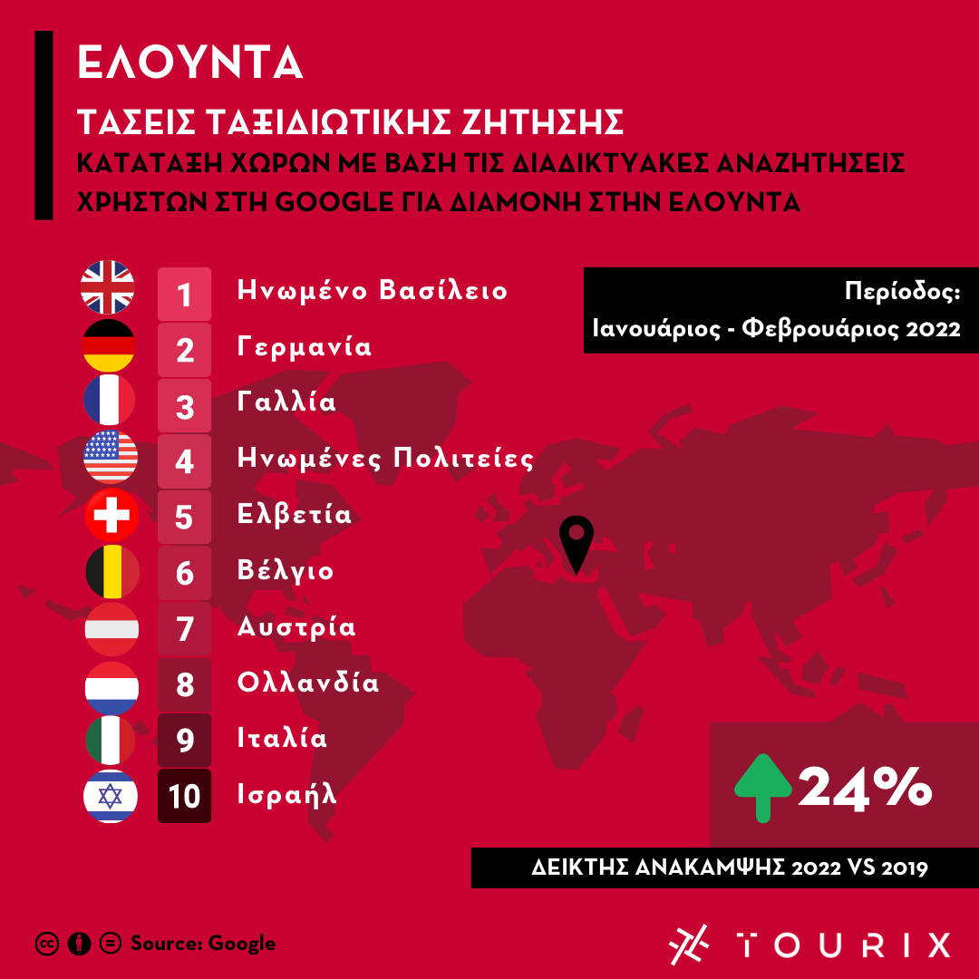 - Το 2022, οι 3 κορυφαίες χώρες σε επίπεδο αναζητήσεων για διαμονή στην Ελούντα είναι το Ηνωμένο Βασίλειο, η Γερμανία και ακολουθεί με μεγάλη διαφορά η Γαλλία. Η ίδια κατάταξη παρατηρήθηκε και το 2021.