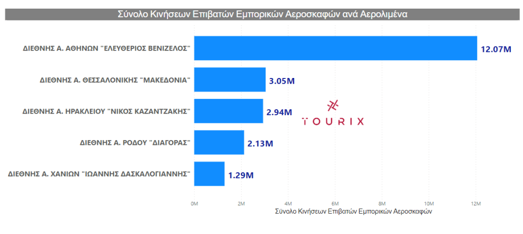Σύμφωνα με τα επικαιροποιημένα στατιστικά της Υπηρεσίας Πολιτικής Αεροπορίας για το πρώτο εξάμηνο του 2023 τα αεροδρόμια με τη μεγαλύτερη επιβατική κίνηση εμπορικών αεροσκαφών είναι τα εξής: το αεροδρόμιο “Ελευθέριος Βενιζέλος” της Αθήνας με πάνω από 12 εκατομμύρια επιβάτες Ακολουθεί το αεροδρόμιο Θεσσαλονίκης “Μακεδονία”, το αεροδρόμιο Ηρακλείου “Νίκος Καζαντζάκης”, το αεροδρόμιο Διαγόρας της Ρόδου και το αεροδρόμιο Χανίων “Ιωάννης Δασκαλογιάννης”.