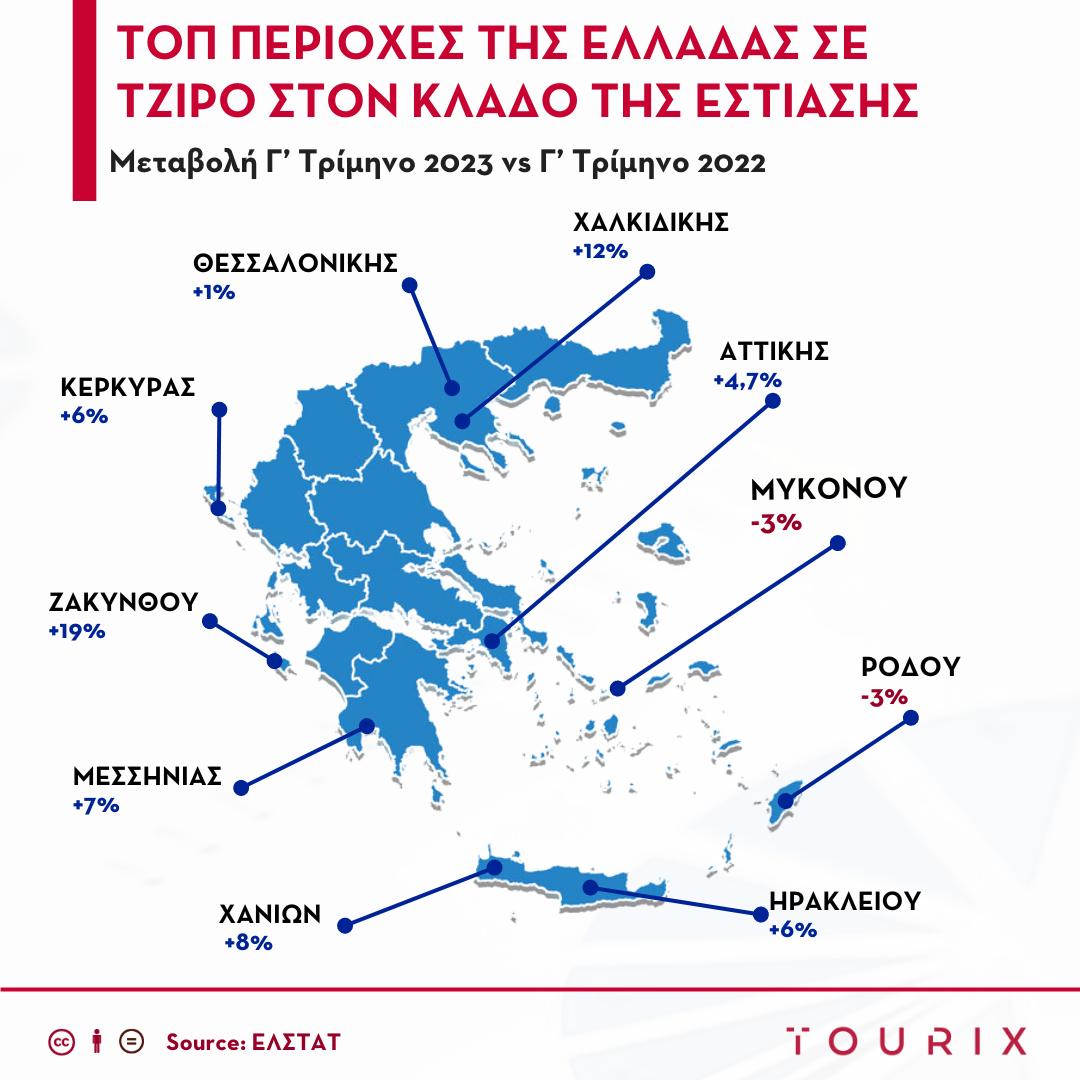 Οι περιοχές της Ελλάδας με τις καλύτερες και χειρότερες επιδόσεις για το Γ’ Τρίμηνο 2023 στην Εστίαση (σε ετήσια βάση)