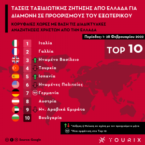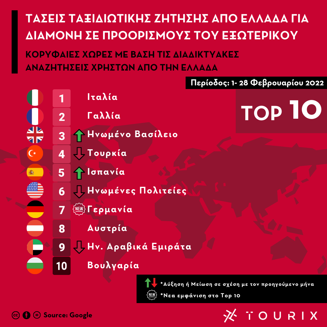 Συγκεντρωτικά oι #Top10 Χώρες με τη μεγαλύτερη ταξιδιωτική ζήτηση των Ελλήνων για το Φεβρουάριο του 2022*:
