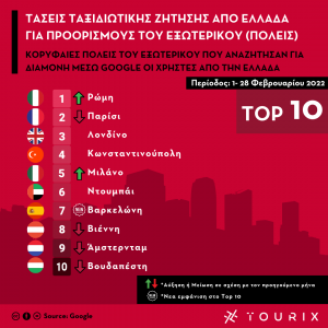 Συγκεντρωτικά oι #Top10 Πόλεις με τη μεγαλύτερη ταξιδιωτική ζήτηση των Ελλήνων για το Φεβρουάριο του 2022*: