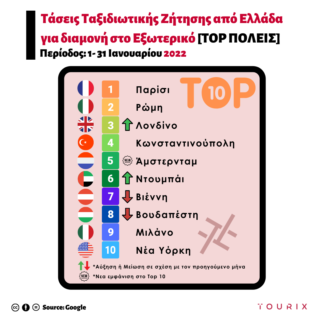 Συγκεντρωτικά oι Top 10 Πόλεις του Εξωτερικού με τη μεγαλύτερη ταξιδιωτική ζήτηση των Ελλήνων για τον Ιανουάριο του 2022*: