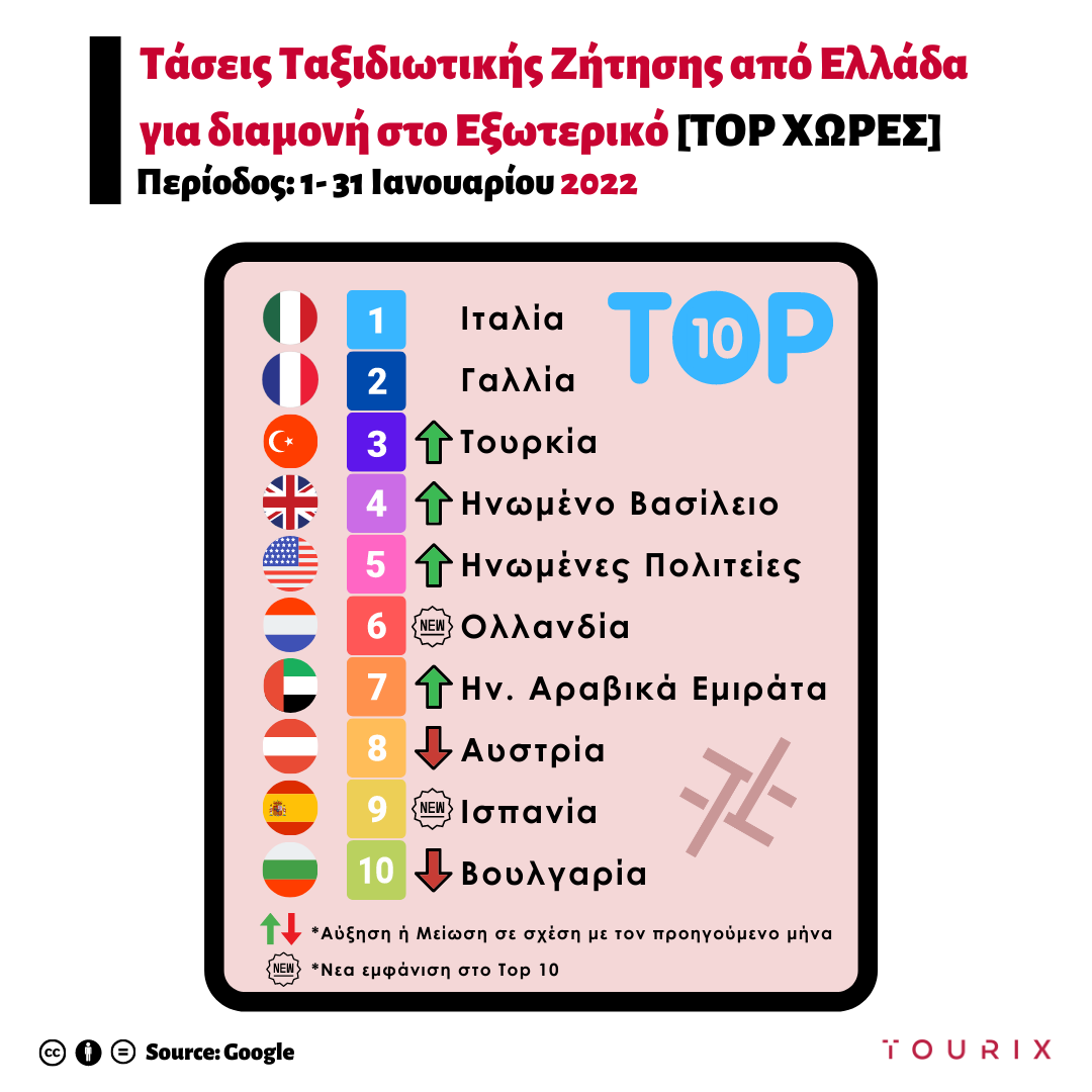 Συγκεντρωτικά oι Top 10 Χώρες με τη μεγαλύτερη ταξιδιωτική ζήτηση των Ελλήνων για τον Ιανουάριο του 2022*: