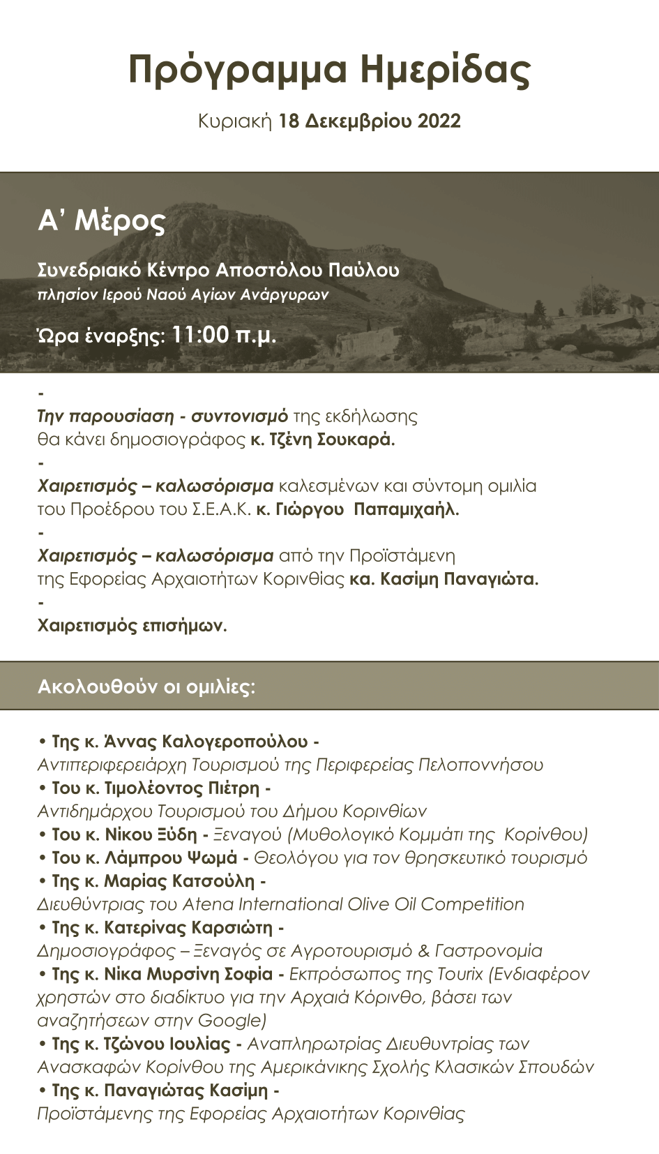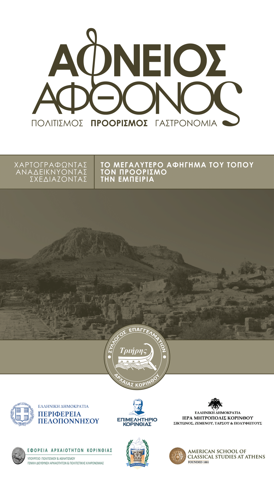 O Σύλλογος Επαγγελματιών Αρχαίας Κορίνθου ( ΣΕΑΚ ) και η δημιουργική ομάδα παρουσιάζουν στις 18 Δεκεμβρίου 2022 στο Συνεδριακό Χώρο “Απόστολος Παύλος” στις 11:00 π.μ. στην Αρχαία Κόρινθο την Ημερίδα ΑΦΝΕΙΟΣ ΑΦΘΟΝΟΣ | πολιτισμός – προορισμός – γαστρονομία με στόχο την τουριστική προβολή της περιοχής.