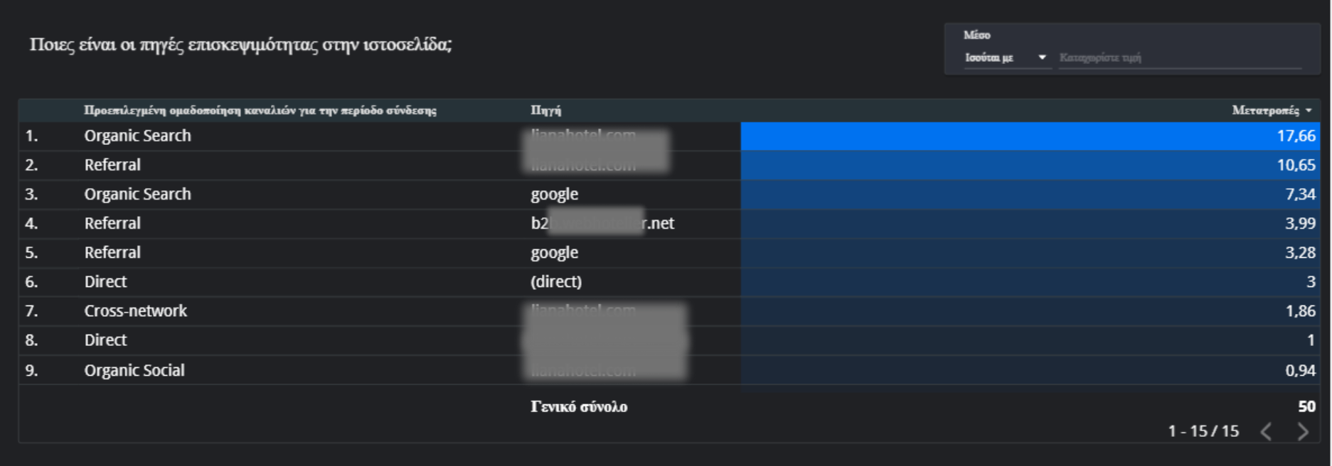 Παρακάτω βλέπουμε ένα χαρακτηριστικό παράδειγμα συνεργάτη όπου το μοντέλο απόδοσης ενίσχυσε τον τρόπο με τον οποίο αξιολογήθηκαν τα κανάλια που έφεραν μετατροπές, και στην προκειμένη κρατήσεις στην ιστοσελίδα. Είναι ευκόλως κατανοητό ότι συγκεκριμένες πηγές επισκεψιμότητας και μετατροπών έχουν αποκρυφτεί για την διασφάλιση ιδιωτικότητας των δεδομένων.