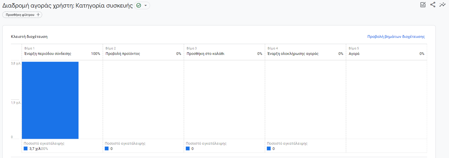 Στην συγκεκριμένη περίπτωση, το πρόβλημα λύθηκε με τον ορισμό custom events που καταγράφουν συγκεκριμένες ενέργειες χρηστών στην σελίδα που αντιπροσωπεύουν βήματα μέχρι και την τελική κράτηση. Πιο συγκεκριμένα, τέθηκε ένα custom μονοπάτι από την στιγμή που αναζητά ο χρήστης διαθεσιμότητα στο κατάλυμα, την προσθήκη του δωματίου στο καλάθι μέχρι και την τελική κράτηση και πληρωμή. Με αυτόν τον τρόπο λύθηκε το πρόβλημα αποτύπωσης του μονοπατιού, εντοπίστηκαν ακριβώς τα βήματα με το μεγαλύτερο ποσοστό εγκατάλειψης και εφαρμόστηκαν αλλαγές για την βελτίωση της εμπειρίας του χρήστη στα συγκεκριμένα σημεία.