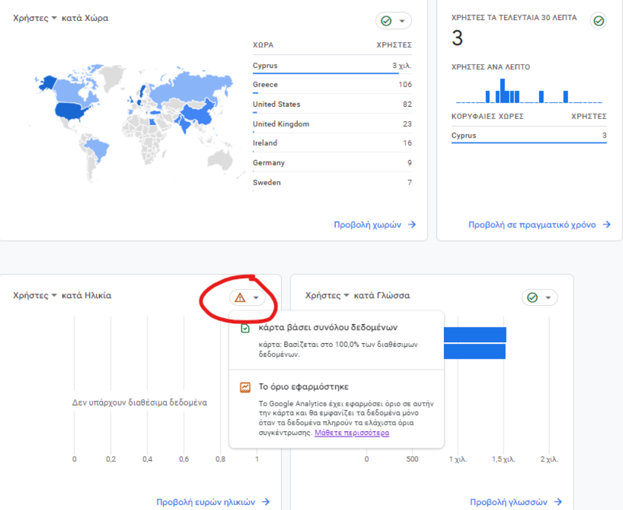 - Όρια Δεδομένων: Εάν λείπουν δεδομένα από την αναφορά ή την εξερεύνηση σας, αυτό μπορεί να οφείλεται στο ότι το Google Analytics έχει εφαρμόσει ένα όριο δεδομένων. Τα όρια δεδομένων εφαρμόζονται για να αποτρέψουν οποιονδήποτε παρακολουθεί μια αναφορά ή μια εξερεύνηση από το να συμπεράνει την ταυτότητα μεμονωμένων χρηστών βάσει δημογραφικών στοιχείων, ενδιαφερόντων ή άλλων ενδείξεων που υπάρχουν στα δεδομένα. Αυτό συμβαίνει συνήθως όταν δεν υπάρχει ο ελάχιστος αριθμός χρηστών στην ιστοσελίδα για την επιλεγμένη χρονική περίοδο.