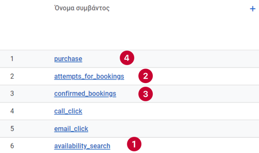 Ένα χαρακτηριστικό παράδειγμα συνεργάτη για τον οποίο αξιοποιούνται τα συμβάντα του GA4 είναι το παρακάτω: Λόγω του ότι οι κρατήσεις του συνεργάτη πραγματοποιούνται σε τρίτο σύστημα, εκτός ιστοσελίδας, η Google αδυνατεί πολλές φορές να αποτυπώσει την διαδρομή του χρήστη από την αναζήτηση δωματίου μέχρι και την τελική κράτηση.