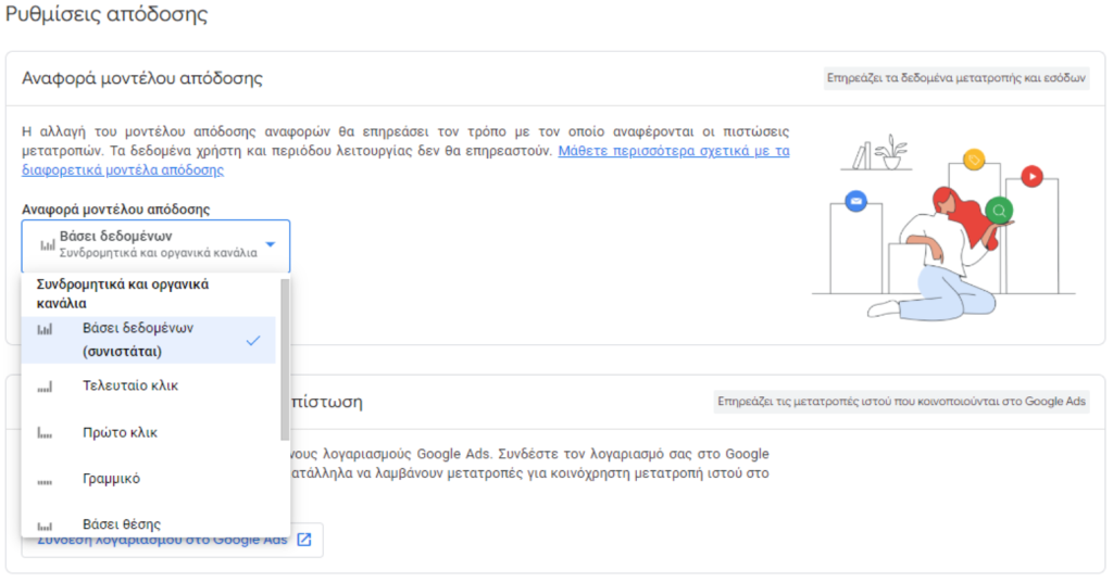 Ένα θέμα που απασχολεί τους marketers σχετικά με τον προσδιορισμό των αποδοτικότερων καναλιών για μια ιστοσελίδα είναι το σύστημα απόδοσης των μετατροπών. Το Universal Analytics το default μοντέλο απόδοσης ήταν το last click το οποίο απέδιδε τις μετατροπές στο τελευταίο κανάλι από όπου μπήκε ο χρήστης στην ιστοσελίδα και πραγματοποίησε την μετατροπή. Αυτό το μοντέλο όμως ίσως δεν αποτυπώνει πάντα την πλήρη εικόνα καθώς ένας χρήστης μπορεί να επισκεφθεί την ιστοσελίδα από πολλά κανάλια πριν πραγματοποιήσει την τελική μετατροπή. Για την επίλυση του ζητήματος αυτού, στο GA4 πλέον υπάρχουν επιπλέον διαφορετικοί τρόπο για την απόδοση των μετατροπών σε κανάλια προέλευσης των χρηστών. οι τρόποι αυτοί είναι: