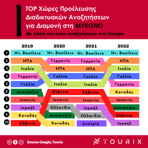 Οι κορυφαίες χώρες σε επίπεδο αναζητήσεων για διαμονή στη Μύκονο για το 2022 ήταν οι ΗΠΑ και το Ηνωμένο Βασίλειο, ενώ ακολουθούν η Ιταλία, η Γαλλία και η Γερμανία. Σημαντικές είναι και οι αγορές-χώρες που συμπληρώνουν τη δωδεκάδα που είναι ο Καναδάς, η Ισπανία, η Αυστραλία, η Ελβετία, το Ισραήλ, η Ολλανδία και η Αυστρία. Η μεγάλη διαφορά με την κατάταξη των τοπ χωρών σε σχέση με το 2021 είναι πως οι τοπ 5 χώρες ήταν το Ηνωμένο Βασίλειο, η Γερμανία, οι ΗΠΑ, η Γαλλία και η Ιταλία.