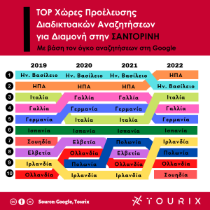 Οι κορυφαίες χώρες σε επίπεδο αναζητήσεων για διαμονή στη Σαντορίνη για το 2022 ήταν οι ΗΠΑ και το Ηνωμένο Βασίλειο, ενώ ακολουθούν με σημαντική διαφορά η Ιταλία, η Γαλλία και η Γερμανία. Σημαντικές είναι και οι αγορές-χώρες που συμπληρώνουν τη δεκάδα που είναι η Ισπανία, η Ιρλανδία, η Πολωνία, η Ολλανδία και η Σουηδία. Η μεγάλη διαφορά με την κατάταξη των τοπ χωρών σε σχέση με το 2021 είναι πως η τοπ χώρα ήταν το Ηνωμένο βασίλειο και ακολουθούσαν οι ΗΠΑ, η Γαλλία, η Γερμανία και η Ιταλία.