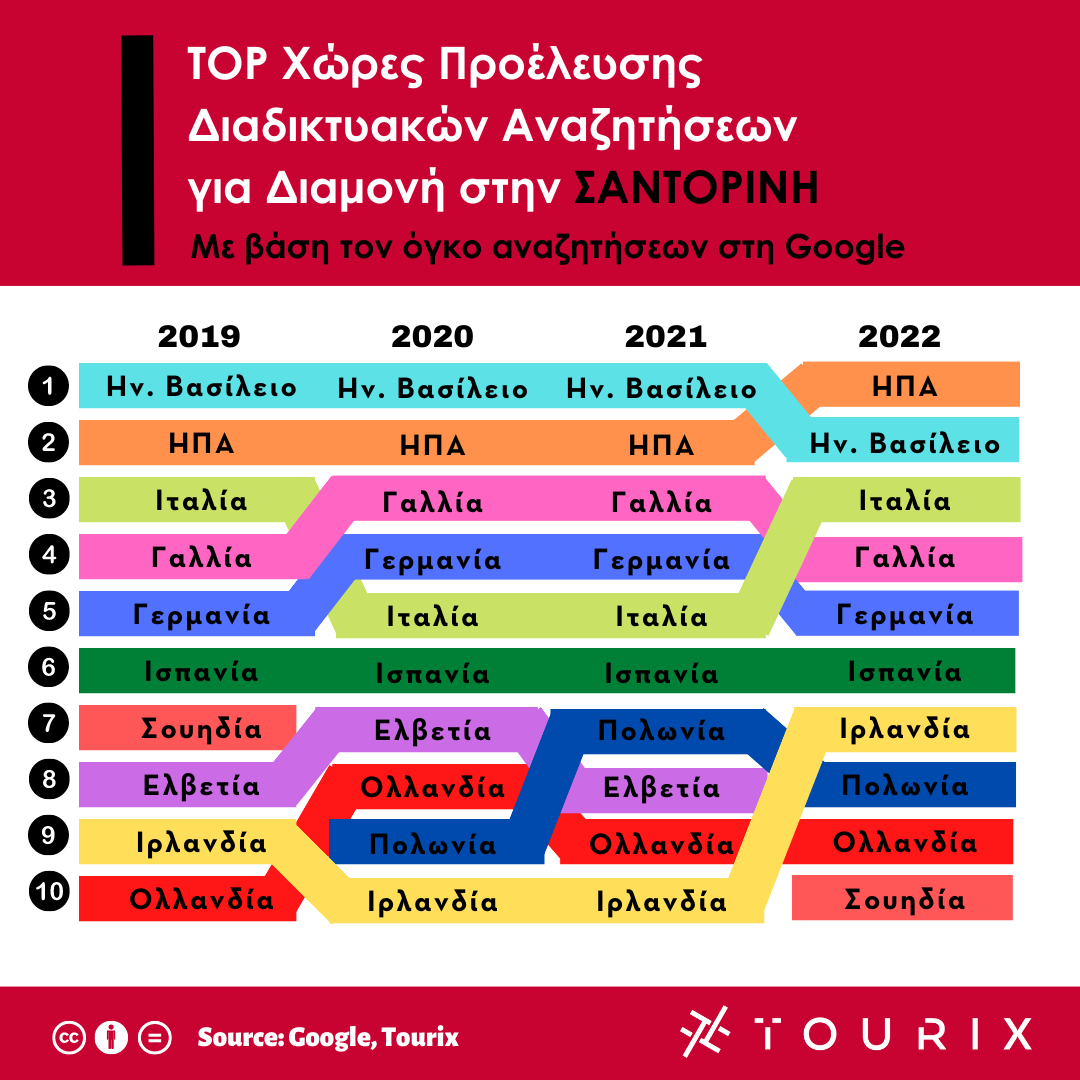 Οι κορυφαίες χώρες σε επίπεδο αναζητήσεων για διαμονή στη Σαντορίνη για το 2022 ήταν οι ΗΠΑ και το Ηνωμένο Βασίλειο, ενώ ακολουθούν με σημαντική διαφορά η Ιταλία, η Γαλλία και η Γερμανία. Σημαντικές είναι και οι αγορές-χώρες που συμπληρώνουν τη δεκάδα που είναι η Ισπανία, η Ιρλανδία, η Πολωνία, η Ολλανδία και η Σουηδία. Η μεγάλη διαφορά με την κατάταξη των τοπ χωρών σε σχέση με το 2021 είναι πως η τοπ χώρα ήταν το Ηνωμένο βασίλειο και ακολουθούσαν οι ΗΠΑ, η Γαλλία, η Γερμανία και η Ιταλία.