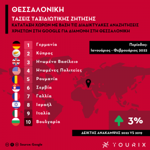 - Το 2022, οι 3 κορυφαίες χώρες σε επίπεδο αναζητήσεων για διαμονή στη Θεσσαλονίκη είναι η Γερμανία, η Κύπρος και το Ηνωμένο Βασίλειο, όπως και για το 2021.