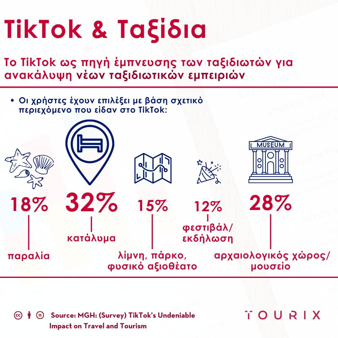 Αναλύοντας τα στοιχεία των ερευνών, φαίνεται ότι για ένα σημαντικό ποσοστό χρηστών, το TikTok έχει συνεισφέρει στο να επισκεφτούν ένα αξιοθέατο ή να κάνουν κράτηση σε κάποιο κατάλυμα. Πιο συγκεκριμένα, ένα 32% των χρηστών έχει επιλέξει ξενοδοχείο / κατάλυμα με βάση σχετικό περιεχόμενο που είδε στο TikTok. Επιπλέον, το 28% των χρηστών επισκέφτηκε κάποιο μουσείο ή αρχαιολογικό χώρο ύστερα από βίντεο που είδε στην πλατφόρμα. Το 18% εξερεύνησε μια νέα πόλη ή παραλία, το 15% εξερεύνησε ένα νέο πάρκο, λίμνη ή φυσικό αξιοθέατο, ενώ το 12% παρακολούθησε ένα φεστιβάλ ή εκδήλωση ύστερα από περιεχόμενο που είδε στο TikTok.