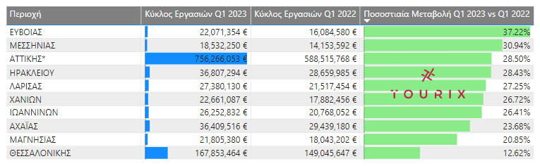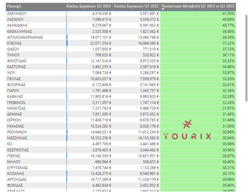 Οι περιοχές με τη μεγαλύτερη ποσοστιαία αύξηση τζίρου το 2023 σε σχέση με το 2022 (Α’ τρίμηνο)
