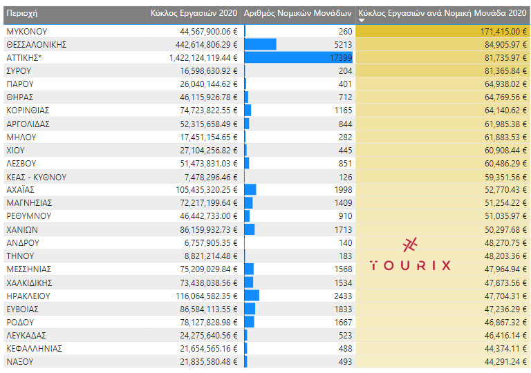 Παρά τον μικρό αριθμό επιχειρήσεων σε σχέση με άλλες μεγαλύτερες περιοχές, η έντονη δραστηριότητα ειδικότερα την θερινή σεζόν στην περιοχή της Μυκόνου, φέρνει το νησί στην πρώτη θέση όσον αφορά τις περιοχές στην Ελλάδα τον μέσο όρο τζίρου ανά επιχείρηση, που φτάνει περίπου τα 170 χιλιάδες ευρώ για όλο το έτος (2020). Ακολουθεί στην δεύτερη θέση η Θεσσαλονίκη με περίπου 85 χιλιάδες ευρώ ανά επιχείρηση και η Αττική με περίπου 82 χιλιάδες ευρώ ανά επιχείρηση. Η Σύρος φαίνεται επίσης υψηλά στην κατάταξη με περίπου 81 χιλιάδες ευρώ τζίρο ανά επιχείρηση.
