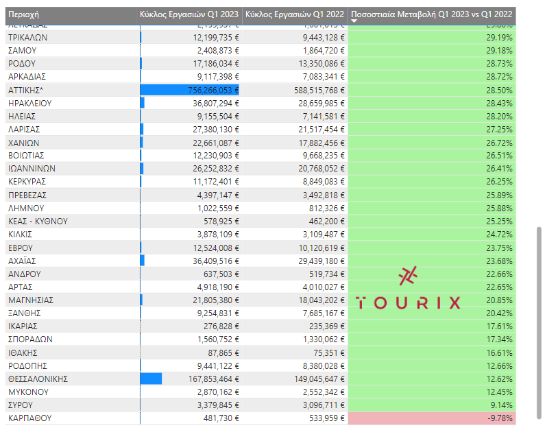 Συγκρίνοντας γενικότερα το πρώτο τρίμηνο του 2023 με το πρώτο τρίμηνο του 2022 βλέπουμε ότι έχουμε συνολικά αύξηση του τζίρου από 1,19 δις σε 1,50 δις ευρώ. Εξετάζοντας όμως την μεταβολή του τζίρου 2023 vs 2022 για το Α’ τρίμηνο κάθε έτους, βλέπουμε ότι στην κατάταξη την μεγαλύτερη αύξηση παρουσιάζουν η Κάλυμνος, η Λακωνία, η Νάξος, η Θήρα, και η Ζάκυνθος με αυξήσεις τζίρου μεγαλύτερες του 40%. Μάλιστα η μόνη περιοχή στην Ελλάδα που παρουσίασε μείωση τζίρου σε σχέση με το Α’ τρίμηνο του 2022 είναι η Κάρπαθος με σχεδόν 10% μείωση τζίρου.