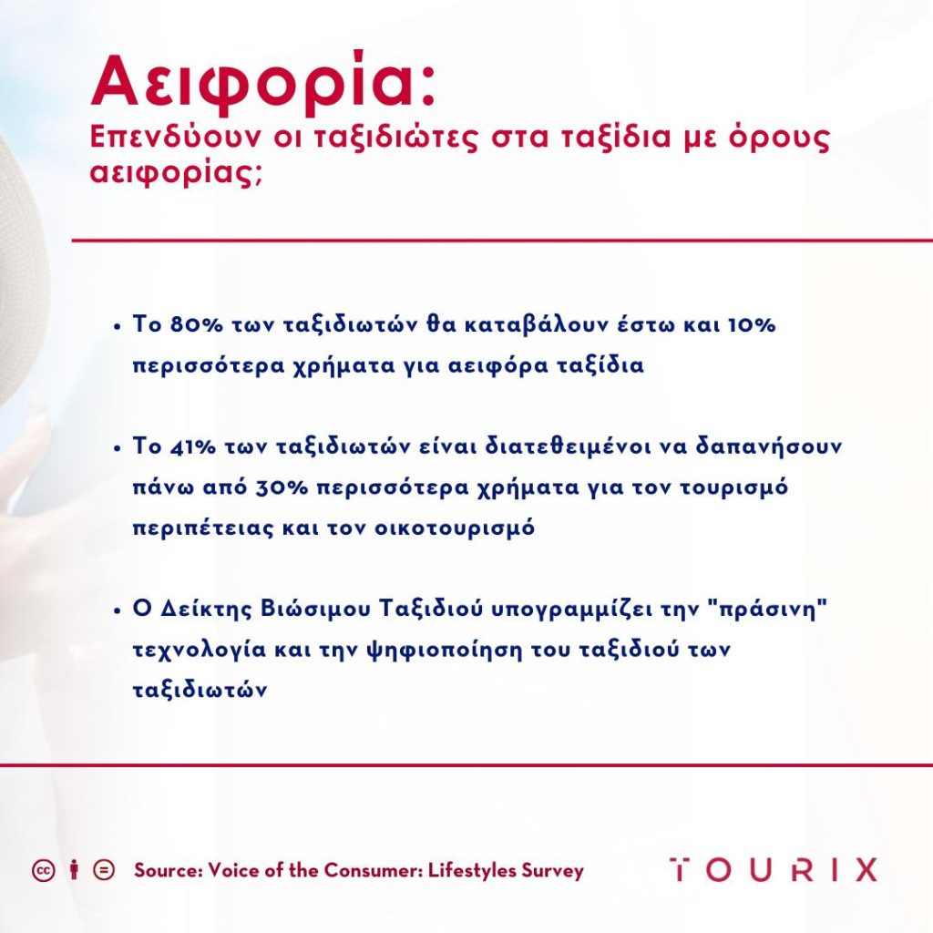 Ακόμη, το 41% των ταξιδιωτών είναι διατεθειμένοι να δαπανήσουν πάνω από 30% περισσότερα χρήματα για τον τουρισμό περιπέτειας και τον οικοτουρισμό, σύμφωνα με την έρευνα Voice of the Consumer: Lifestyles Survey, που αναφέρεται στον πρόσφατα δημοσιευμένο Δείκτη Βιώσιμων Ταξιδιών 2023 του Euromonitor.