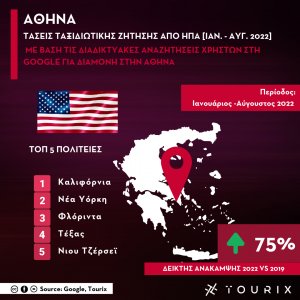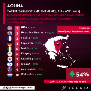Για τη περίοδο Ιανουαρίου – Αυγούστου του 2022, παρατηρείται αύξηση του συνολικού όγκου διαδικτυακών αναζητήσεων σχετικά με διαμονή στην Αθήνα κατά 54% σε σχέση με το 2019 και αύξηση κατά 228% σε σχέση με το 2021.