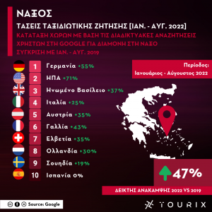Από την αρχή του χρόνου μέχρι και τον Αύγουστο του 2022, παρατηρείται αύξηση του συνολικού όγκου διαδικτυακών αναζητήσεων για διαμονή στη Νάξο κατά 47% σε σχέση με το 2019 και αύξηση κατά 66% σε σχέση με το 2021.