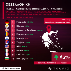 Η Θεσσαλονίκη για τη περίοδο Ιανουαρίου – Αυγούστου του 2022 παρουσιάζει αύξηση του συνολικού όγκου διαδικτυακών αναζητήσεων για διαμονή κατά 63% σε σχέση με το 2019 και αύξηση κατά 194% σε σχέση με το 2021.