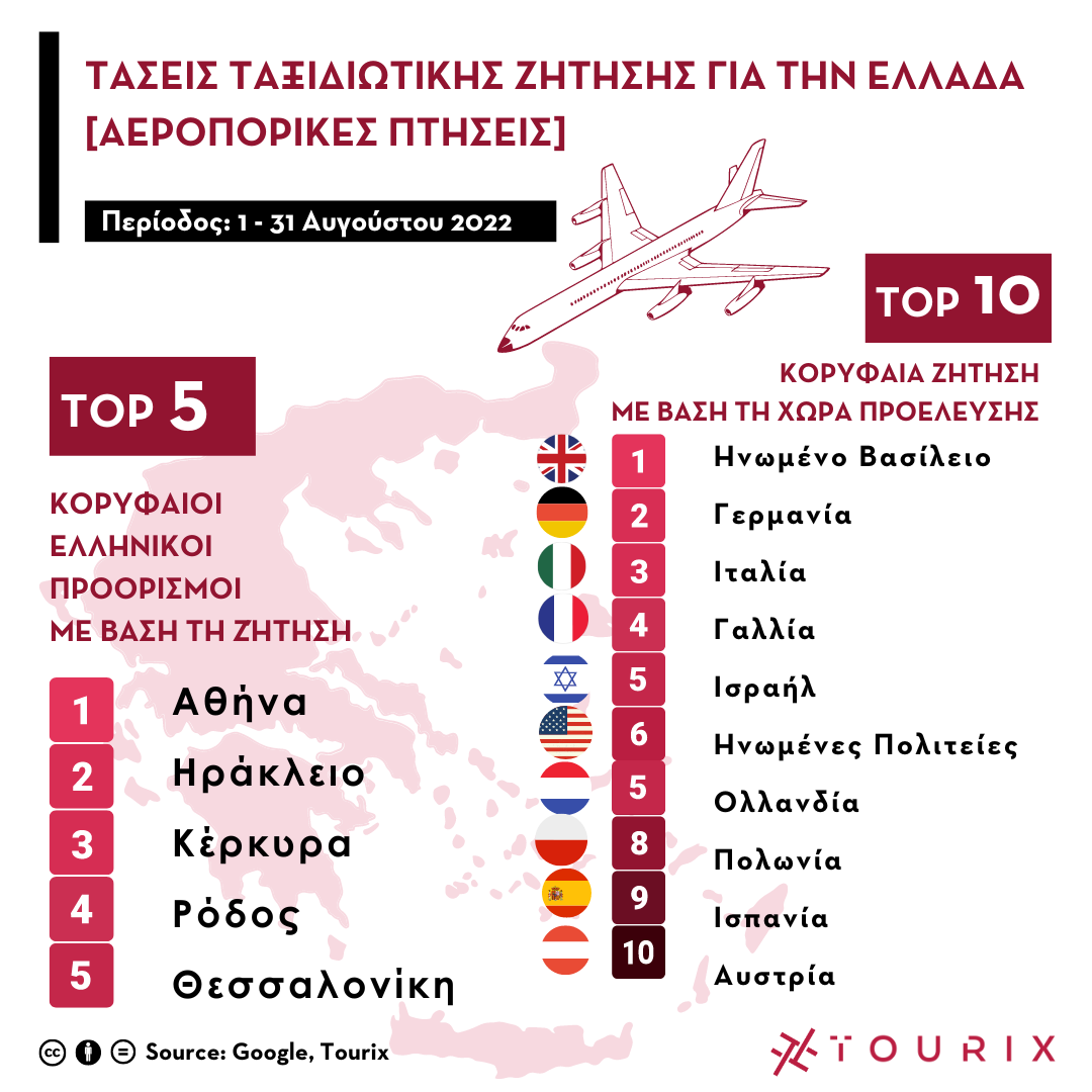 ΤΟΠ Εθνικότητες / Χώρες Προέλευσης με τη μεγαλύτερη ταξιδιωτική ζήτηση για αεροπορικές πτήσεις προς Ελλάδα βάσει διαδικτυακών αναζητήσεων (Αύγουστος 2022)