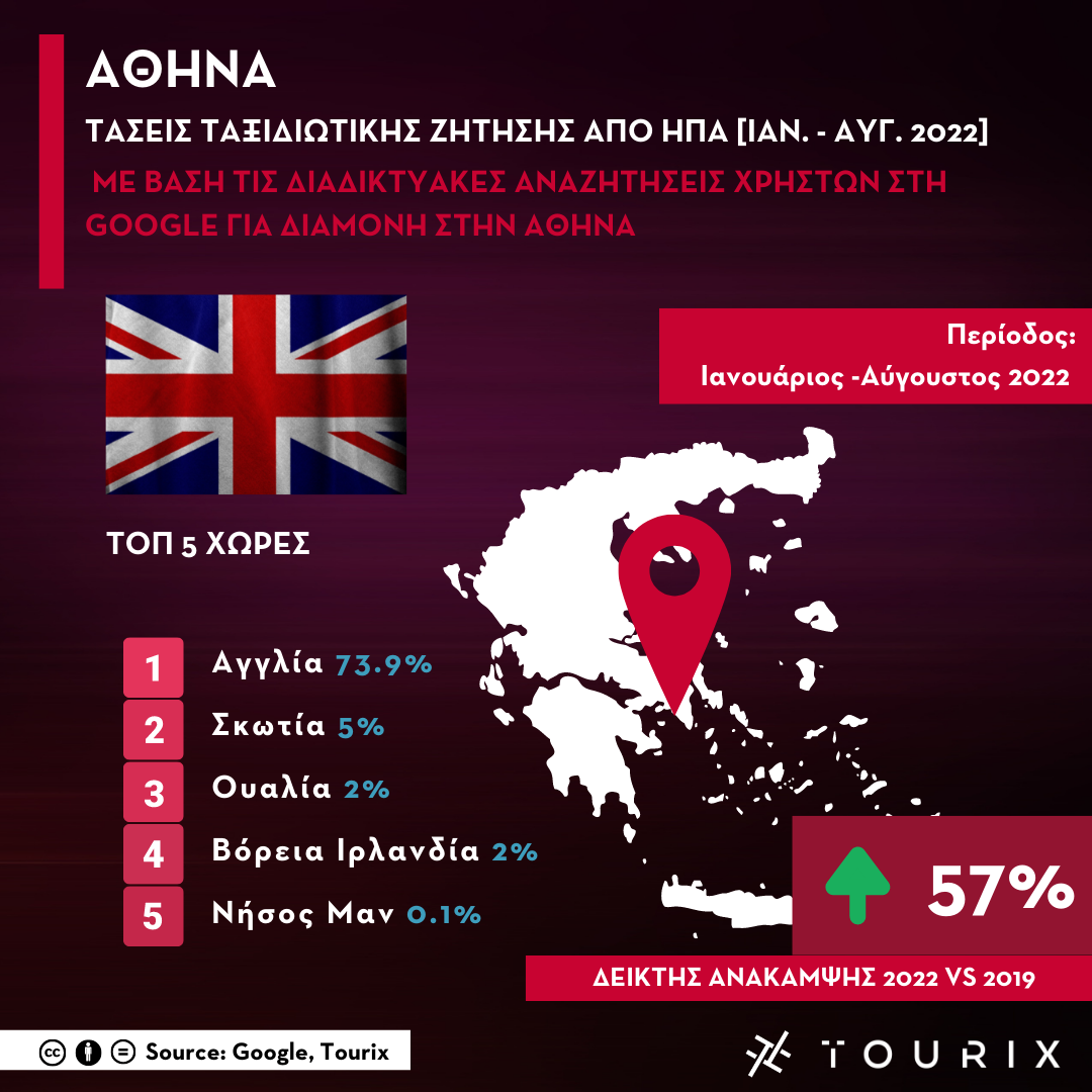 Αναλύοντας τη δεύτερη μεγαλύτερη αγορά της Αθήνας, το Ηνωμένο Βασίλειο, οι αναζητήσεις και το ενδιαφέρον για διαμονή στην Αθήνα προέρχονται κατα 73.9% από την Αγγλία, 5% από τη Σκωτία 5%, το 2% από Ουαλία, 2% από Βόρεια Ιρλανδία και 0.1% από τη Νήσο Μαν.