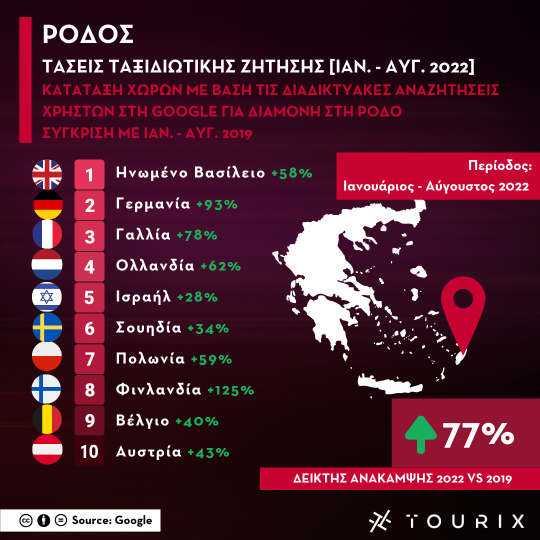 Σε επίπεδο έτους, το πρώτο οκτάμηνο του 2022 έχουμε αύξηση του συνολικού όγκου διαδικτυακών αναζητήσεων για διαμονή στη Ρόδο κατά 77% σε σχέση με το 2019 και αύξηση κατά 121% σε σχέση με το 2021. Οι κορυφαίες χώρες με σημαντική διαφορά βάσει αναζητήσεων είναι το Ηνωμένο Βασίλειο και η Γερμανία, ακολουθούν η Γαλλία και η Ολλανδία.