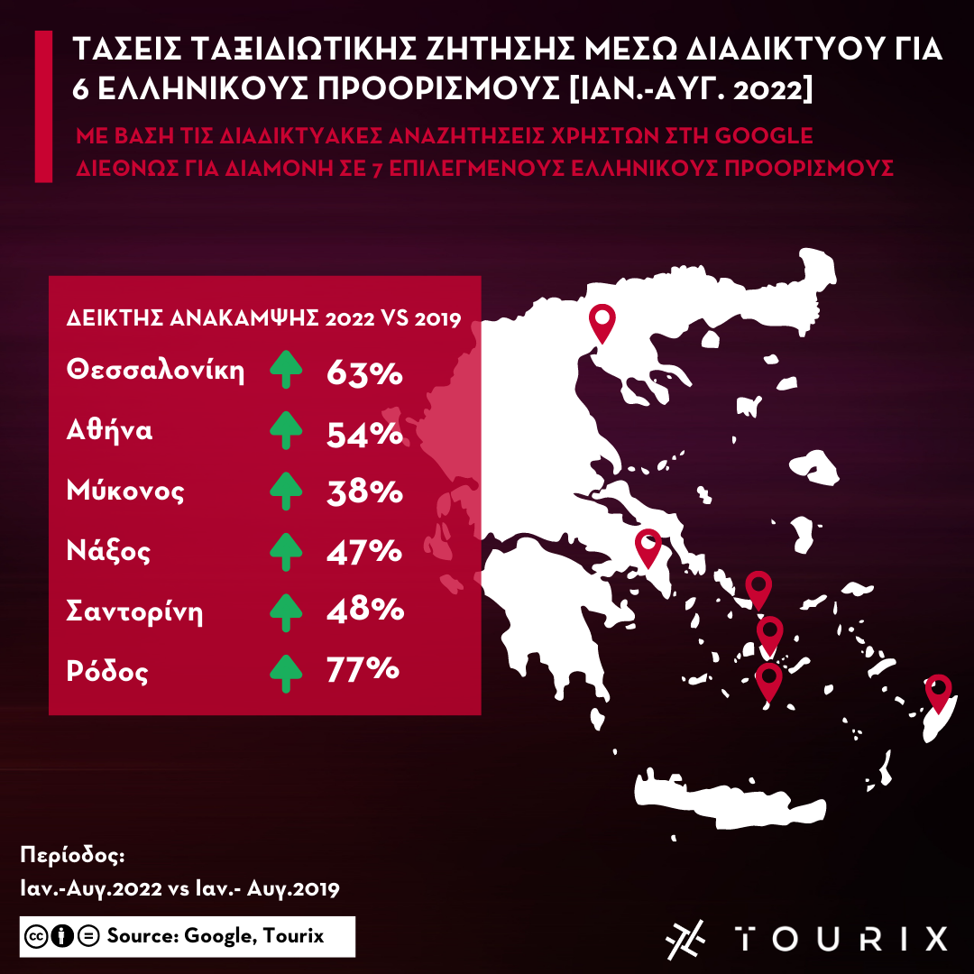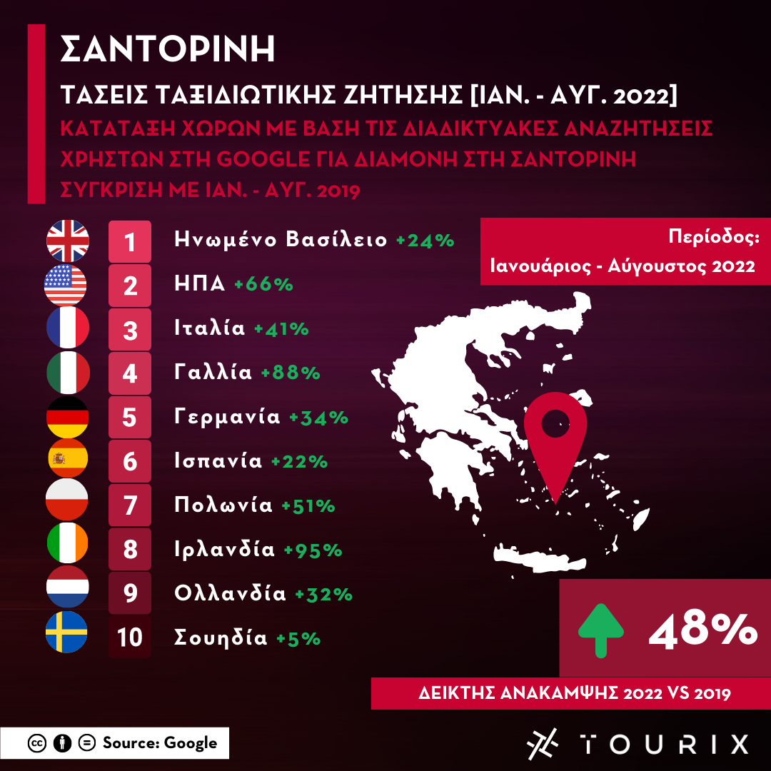 Συγκριτικά με το 2019, το πρώτο οκτάμηνο του 2022 παρατηρείται αύξηση του συνολικού όγκου διαδικτυακών αναζητήσεων κατά 38%, και αύξηση κατά 75% σε σχέση με το 2021. Οι 3 χώρες με τη μεγαλύτερη ποσοστιαία αύξηση του συνολικού όγκου αναζητήσεων για το πρώτο οκτάμηνο του 2022, σε σχέση με την αντίστοιχη περίοδο του 2019, είναι η Γαλλία (αύξηση 62%), οι ΗΠΑ (αύξηση 59%) και η Γερμανία (αύξηση 43%). Αντίθετα, παρατηρήθηκε ελαφρώς μικρότερη ζήτηση μέσω διαδικτύου για διαμονή στη Σαντορίνη από την Αυστραλία.