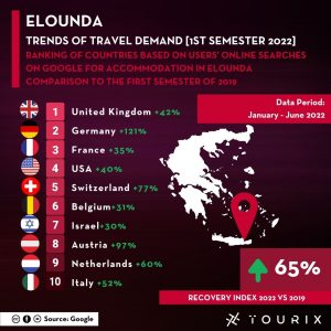 In the first semester of 2022 we have a significant increase in the total volume of online searches for accommodation in Elounda by 65% compared to 2019 and an increase of 107% compared to 2021. The top 4 countries in terms of searches for accommodation in Elounda are the United Kingdom, Germany followed by France and the USA by a large margin. It is worth pointing out that Germany (121% increase), Austria (97% increase) and Switzerland (77% increase) show the largest percentage increase in online searches compared to 2019.