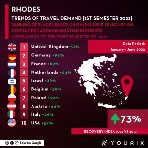 The tourist demand for the island of Rhodes remains on a significant rise. Specifically, in the first semester of 2022 we have an increase in total accommodation volume of online searches for Rhodes by 73% compared to 2019 and an increase of 152% compared to 2021. The top two countries with a significant difference based on searches are the United Kingdom and Germany, followed by France and Netherlands. In particular, Germany (99% increase) and France (69% increase) and Netherlands (64% increase) show the largest increase in searches compared to 2019.