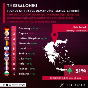 Thessaloniki for the first half of 2022 shows an increase in the total volume of online searches for accommodation by 51% compared to 2019 and an increase of 239% compared to 2021. Top 3 countries in terms of searches for accommodation in Thessaloniki for 2022 are the USA,Germany,UK followed by North Macedonia and France trailing a little behind in fifth place. In particular, the largest increase in searches compared to 2019 is shown by the USA (65% increase), Germany (47% increase) and the United Kingdom (37% increase).