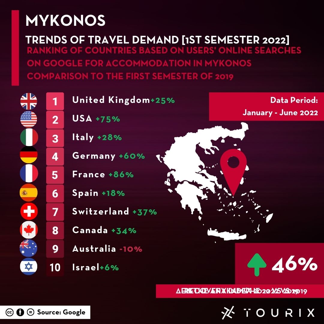 The island of Mykonos shows an increased volume of searches in relation to accommodation from most of the countries monitored.