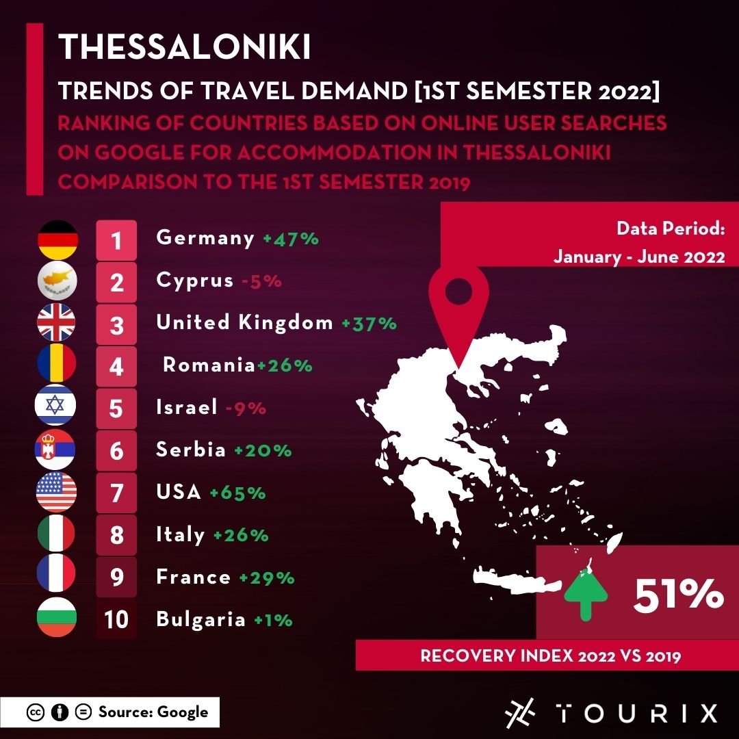 Thessaloniki for the first half of 2022 shows an increase in the total volume of online searches for accommodation by 51% compared to 2019 and an increase of 239% compared to 2021. Top 3 countries in terms of searches for accommodation in Thessaloniki for 2022 are the USA,Germany,UK followed by North Macedonia and France trailing a little behind in fifth place. In particular, the largest increase in searches compared to 2019 is shown by the USA (65% increase), Germany (47% increase) and the United Kingdom (37% increase).